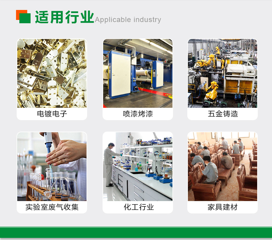 五金、噴漆、切割、半導體、冶金等行業生產過程中產生的含塵含味氣體,特別適合粉塵、廢氣等濃度大、溫度大、濕度大、易燃、易爆等工況。